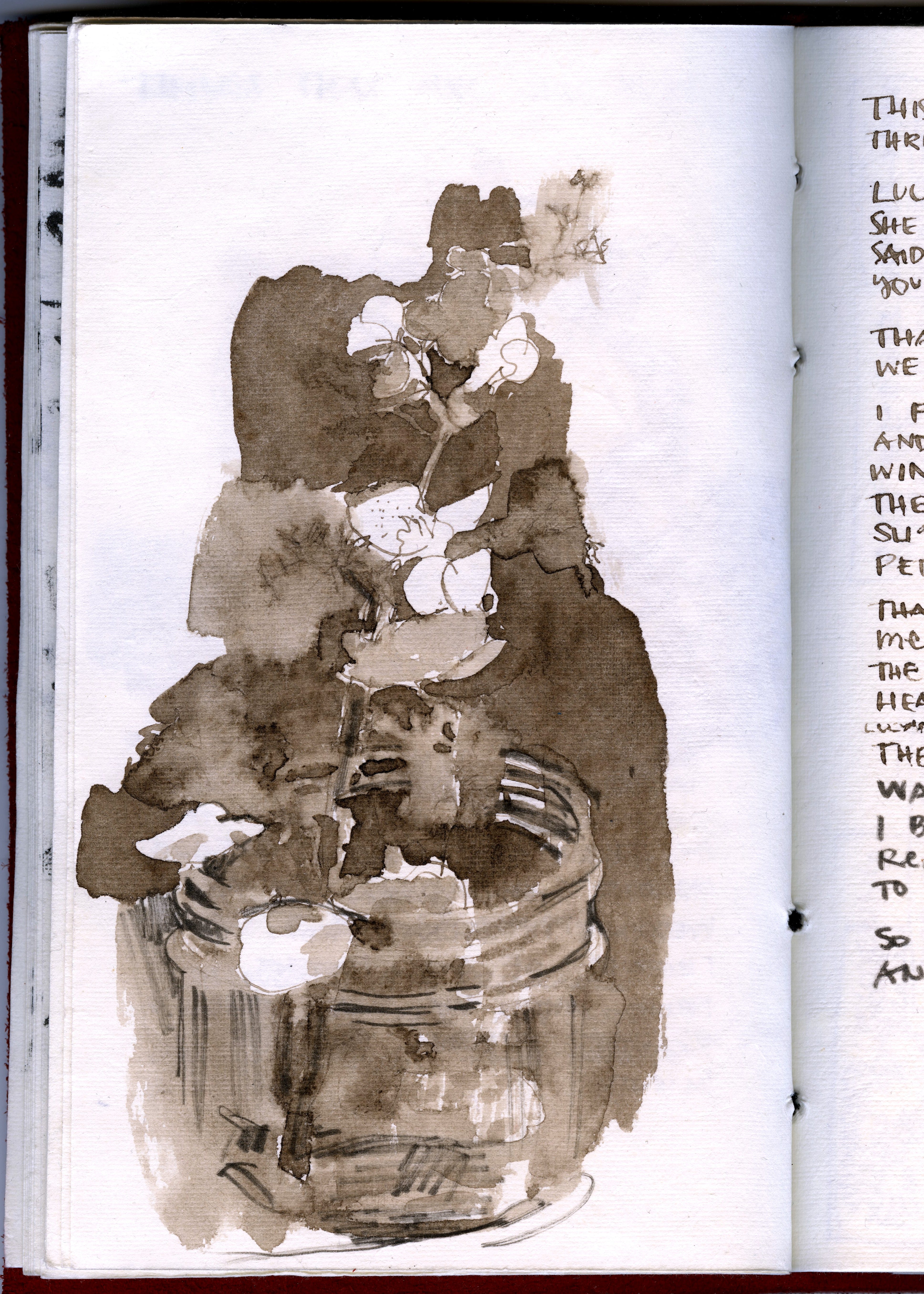 Today, then, just one drawing, in the beautiful hand-made journal Theresa gave me, that felt too lovely to use for a long time, but now I am using it.